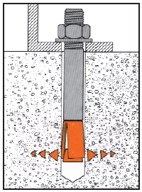 By tightening the nut the cone is drawn into the thickwalled expansion sleeve. It is expanded and locked into position against the side wall of the drilled hole.